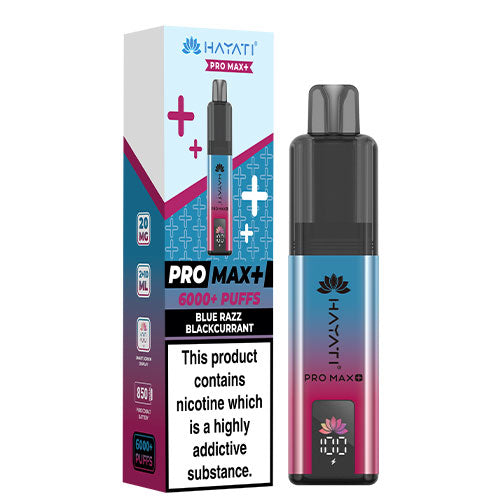 The Hayati Pro Max+ 6000, comes with a 2ml e-liquid tank capacity and refill container that automatically refills the tank when attached, 20mg/ml nicotine, with a Type-C rechargeable battery.