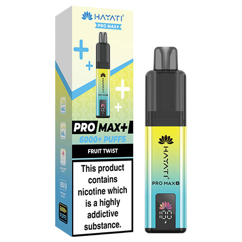 The Hayati Pro Max+ 6000, comes with a 2ml e-liquid tank capacity and refill container that automatically refills the tank when attached, 20mg/ml nicotine, with a Type-C rechargeable battery.